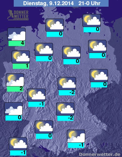 In der Nacht zum Mittwoch ziehen von Nordwesten her dichte Wolken mit zeitweiligen Regen- und Schneeregenfällen südostwärts. Bis zum Morgen erreichen die Niederschläge in etwa ein Linie vom Saarland bis ins westliche Mecklenburg-Vorpommern. Stellenweise besteht Glättegefahr durch überfrierende Nässe. Südöstlich dieser Linie bleibt es dagegen, bei meist aufgelockerter Bewölkung, trocken. An der Nord- und Ostsee weht ein vielfach starker bis stürmischer, in Böen teils orkanartiger Wind, auch im Westen und Norden des Landes weht ein teils starker, in höheren Lagen stürmischer Wind. Die Temperatur sinkt auf 4 Grad in Ostfriesland und bis etwa -4 Grad im Allgäu.