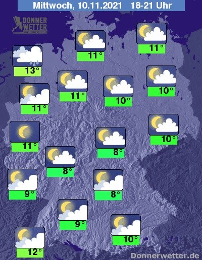 Heute Abend bringen dichte Wolken im Nordseeumfeld einige Tropfen. Einige, meist noch aufgelockerte Wolken halten sich über dem Süden des Landes, sonst ist es aber überwiegend locker bewölkt bis sternenklar. Es bleibt trocken bei Werten von 8 Grad im Eichsfeld und bis 13 Grad an der Nordsee.