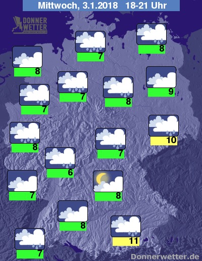 Heute Abend bleibt es weitgehend dicht bewölkt, einzelne Auflockerungen sind aber möglich, vor allem über der Nordhälfte und im Alpenvorland fällt zeitweise Regen. sonst ist es auch oft trocken. Die Temperatur liegt bei 6 bis 11 Grad. Vor allem in der Nordhälfte ist es noch oft stürmisch, an den Küsten herrscht teils Sturm.