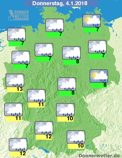 Am Donnerstag kann sich über Sachsen hier und da mal die Sonne zeigen, sonst ist es aber verbreitet bedeckt und es fällt häufig, im Süden auch kräftiger und langanhaltender Regen. Die Temperatur steigt auf 7 bis 13 Grad.