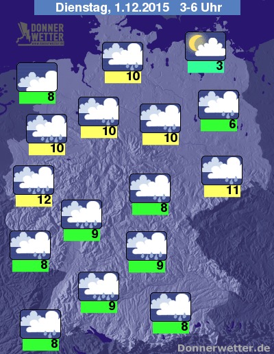 In der kommenden Nacht bleibt der Himmel überwiegend bedeckt, vor allem im Norden sind aber auch Auflockerungen möglich, hier bleibt es auch oft trocken, sonst fällt hingegen teils langanhaltender Regen. Die Temperatur sinkt auf 12 Grad in Köln und bis etwa 3 Grad an der Müritz. An den Küsten und über der Südhälfte des Landes weht ein oft starker bis stürmischer Wind, dabei sind auch schwere Sturmböen möglich.