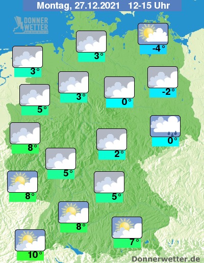 Heute Abend zieht von Südwesten her zeitweiliger Regen auf, der etwa das westliche NRW, Hessen und das westliche Bayern erreicht. Nordöstlich und östlich davon bleibt es bei ebenfalls dichter Bewölkung trocken. Hier und da ist es neblig-trüb. Die Temperatur liegt bei -3 Grad in Neubrandenburg und bis 10 Grad in Freiburg.