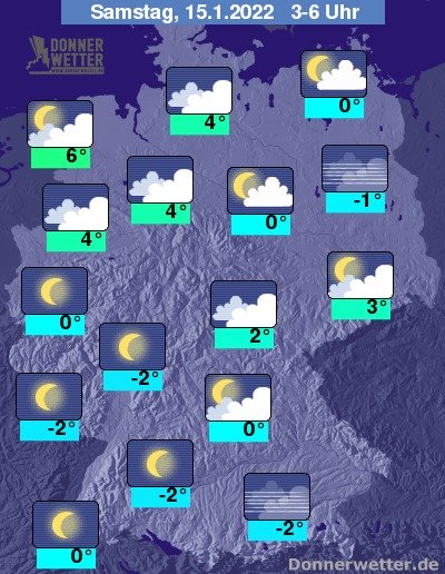 In der Nacht zum Samstag ist es über der Südwesthälfte der Republik sowie im Nordosten weitgehend sternenklar. Im übrigen Norden und Osten hält sich hingegen oft dichte Bewölkung, dazu bleibt es trocken. Stellenweise bildet sich Nebel. Die Temperatur sinkt auf 6 Grad an der Nordsee und bis -2 Grad am Pfälzer Wald.