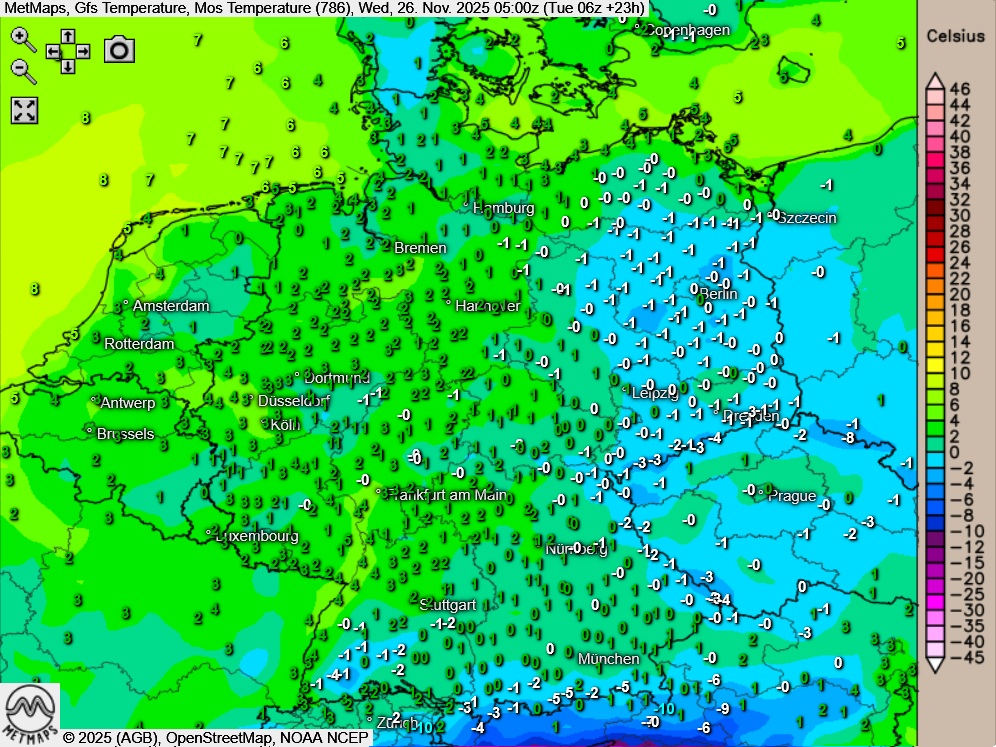 Die Wetter- und Temperaturkarte für Mittwochfrüh sowie die 24-Stunden-Regenmengen am Mittwoch nach GFS:
