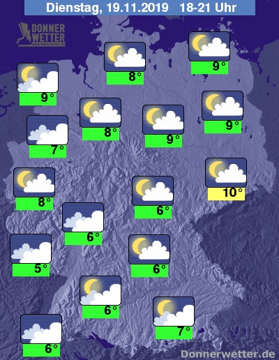 Am Abend bleibt es bis auf wenige Ausnahmen im Norden niederschlagsfrei. Dazu gibt es eine Mischung aus Wolken und Sternen. Insbesondere im Südwesten bleibt die Wolkendecke auch dichter.