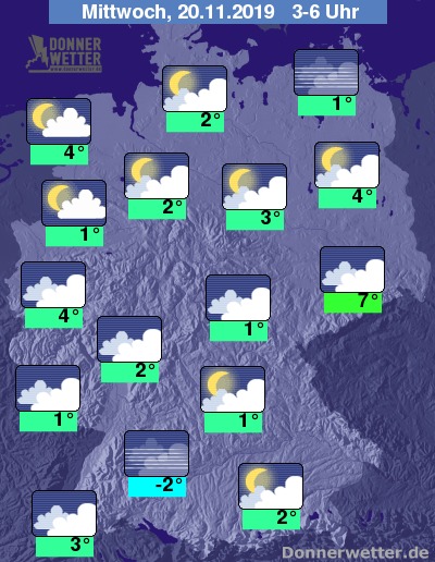 Während der zweiten Nachthälfte präsentiert sich der Himmel teils wolkenverhangen, teils aufgeklart, Niederschlag fällt kaum. Stellenweise bildet sich Nebel.