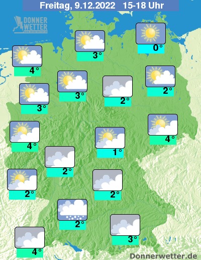Am Freitagnachmttag zeigt sich der Himmel über weiten Landesteilen bedeckt oder aufgelockert bewölkt, vor allem im Umfeld der Küsten sind auch längere heitere oder sonnige Phasen möglich. Im Süden setzt im Nachmittagsverlauf regional Schneefall ein, sonst bleibt es meist trocken.