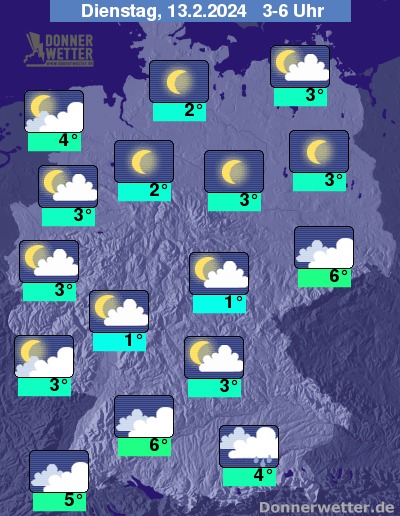 In der Nacht zum Dienstag sind am bayerischen Alpenrand hier und da ein paar Flocken oder Tropfen möglich. Im übrigen Bundesgebiet zeigt sich der Himmel oft locker bewölkt bis sternenklar, es können aber auch einige Wolken durchziehen. Es bleibt trocken bei Tiefstwerten von 6 Grad in Stuttgart und etwa 1 Grad in Jena.