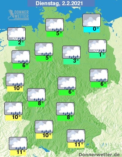 Am Dienstag bleibt es weitgehend bedeckt, dabei fält anfangs nur in den östlichsten und westlichsten Landesteilen gebietsweise Regen, im Osten auch zum Teil Schnee. Im Tagesverlauf setzt dann von Westen her Regen ein, im Norden und Nordosten fallen die Niederschläge häufig als Schnee. Die Temperatur steigt auf 0 Grad in Rostock und bis 11 Grad in Freiburg.