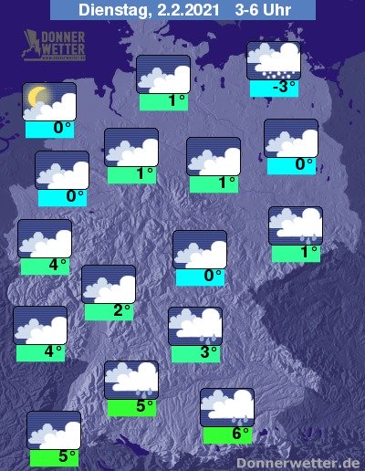 In der kommenden Nacht bleibt es trüb oder bedeckt und es fällt bevorzugt über der Osthälfte gebietsweise leichter Regen, im Norden und Nordosten meist Schnee. Weiter nach Westen hin bleibt es weitgehend trocken. Es bildet sich stellenweise Nebel. Die Temperatur sinkt auf 6 Grad in München und bis -3 Grad in Neubrandenburg.