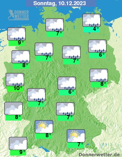 Am Sonntag zeigt sich der Himmel stark bewölkt oder es ist bedeckt, dabei fällt in weiten Landesteilen Regen. Längere trockene Abschnitte sind heute am ehesten südlich der Donau zu erwarten. An der Nordsee sowie in höheren Lagen weht ein teils stürmischer, sonst mäßiger bis frischer Südwestwind.