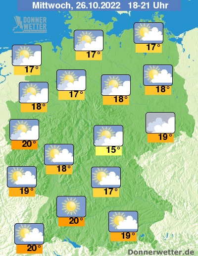 Heute Abend scheint vor allem im Süden verbreitet die Sonne, sonst ist es noch teils stark, meist jedoch nur locker bis aufgelockert bewölkt. Es bleibt trocken bei 15 Grad im Vogtland und 20 Grad am Oberrhein.
