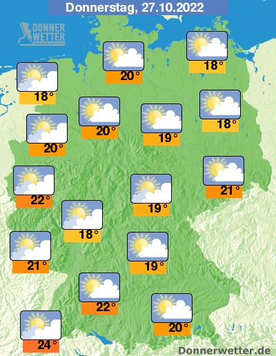 Am Donnerstag ist es oft heiter bis sonnig, gebietsweise ist es auch trüb oder stark bewölkt, dabei bleibt es trocken. Die Höchstwerte erreichen 18 Grad in Rostock und bis 24 Grad in Freiburg.