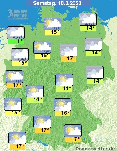 Am Samstag ist es verbreitet wechselnd bis stark bewölkt, im Norden und Westen bilden sich dabei gebietsweise Schauer, während es sonst trocken bleibt. Die Temperatur steigt auf 11 Grad an der Nordsee und bis 17 Grad im Berchtesgadener Land.