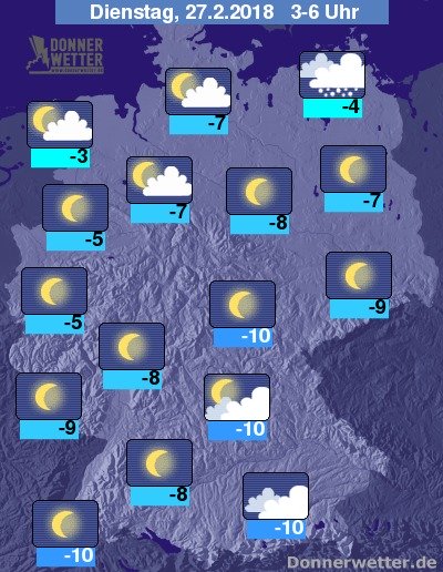 In der Nacht zum Dienstag klart der Himmel über Deutschland verbreitet auf, lockere Wolkenfelder ziehen jedoch weiterhin über den Norden hinweg. Im Nordosten bringen dichte Wolken auch gebietsweise Schneefall, sonst bleibt es aber trocken. Die Temperatur sinkt auf -3 Grad im nördlichen Emsland und bis -10 Grad im Münchner Umland.
