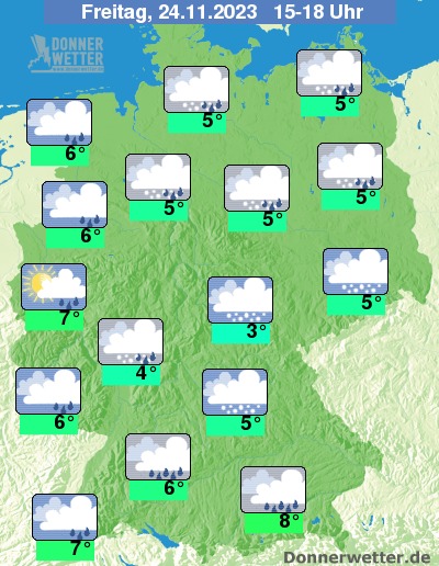 Am Freitagnachmittag und am Abend bleibt der Himmel über weiten Landesteilen stark bewölkt oder es ist bedeckt, dabei muss verbreitet mit Niederschlägen gerechnet werden und möglichen kurzen Graupelgewittern gerechnet werden. Die Schneefallgrenze liegt am Nachmittag bei 300 bis 600 m, an den Alpen sind bei einer bis in die Täler absinkenden Schneegrenze auch länger anhaltende Schneefälle zu erwarten.