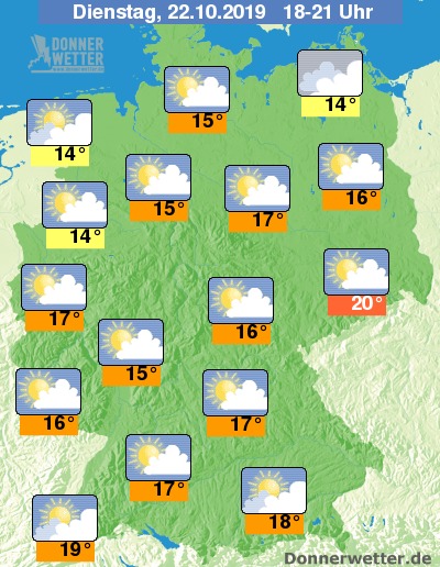 Die Temperaturen liegen vor Dämmerungsbeginn noch zwischen 14 und 20 Grad. Am wärmsten bleibt es dabei im Osten und Süden.