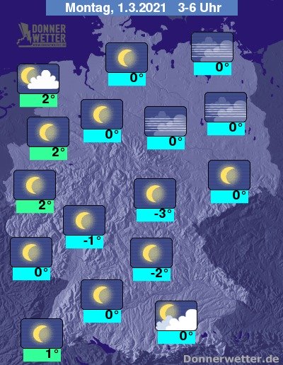 In der Nacht zum Montag ist der Himmel verbreitet sternenklar, nur selten ziehen auch ein paar Wolken durch, dazu bleibt es trocken. Die Temperatur sinkt auf 2 Grad am Niederrhein und bis -3 Grad im Thüringer Becken.