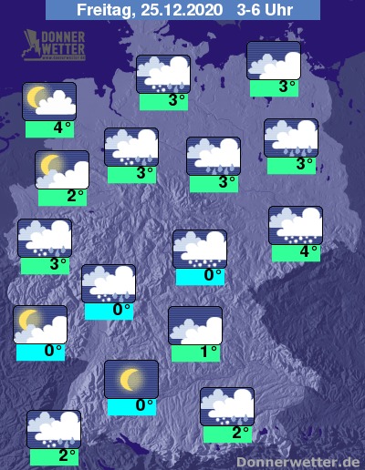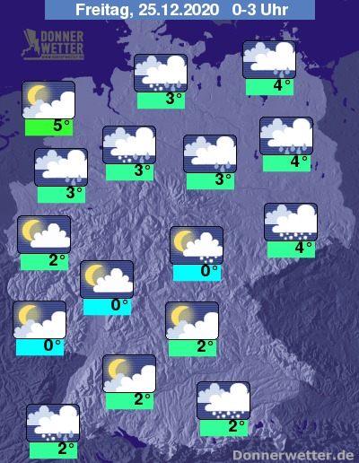 Während der zweiten Nachthälfte treten regional Regen- oder Schneeregen-, im Bergland auch Schneeschauer auf. Sonst leuchten neben durchziehenden Wolkenfeldern auch zeitweise Halbmond und Sterne.