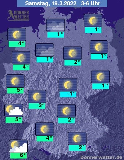 In der Nacht zum Samstag zeigt sich der Himmel über Deutschland weitgehend sternenklar. Entlang des Rheins sind auch mal einige Wolken möglich. Es bleibt überall trocken bei Tiefstwerten von 6 Grad in Freiburg und bis -1 Grad in Jena.