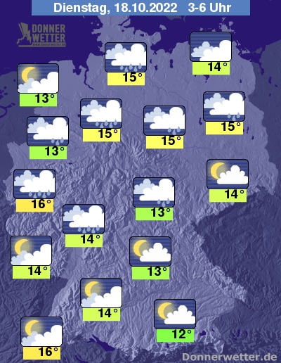Am Dienstag ist es über dem Norden und Westen oft heiter, teils ziehen auch einige Wolken durch, jedoch bleibt es meist trocken. Im übrigen Bundesgebiet ziehen teilweise dichte Wolken durch, teils zeigen sich auch Aufheiterungen, dabei fällt gebietsweise Regen. Die Temperatur erreicht 15 Grad in Bremerhaven und bis 22 Grad in München.