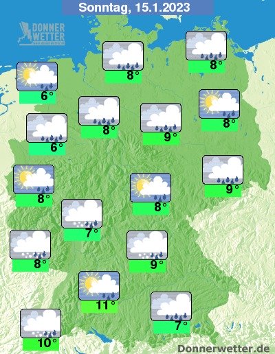 Am Sonntag zieht oft starke, teils auch aufgelockerte Bewölkung durch, dabei bilden sich gebietsweise Schauer, die zum Teil auch als Schnee oder Schneeregen niedergehen. Die Temperatur erreicht 6 Grad in Cuxhaven und bis 11 Grad in Stuttgart. Vor allem im Norden weht ein stürmischer Wind, an der See und auf den Bergen herrscht teilweise schwerer Sturm.