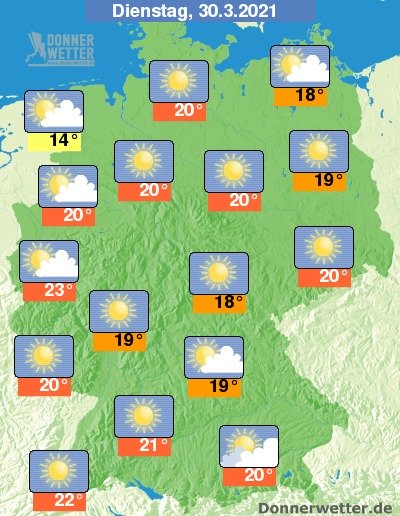 Am Dienstag strahlt über dem Bundesgebiet verbreitet die Sonne und es ziehen nur lockere Wolkenfelder durch, dabei bleibt es trocken. Die Temperatur steigt auf teils nur 14 Grad an der Nordsee und bis 23 Grad in Köln.