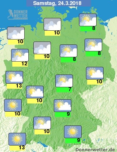 Am Samstag ist es im Nordseeumfeld stark bewölkt, dabei ist hier und da etwas Regen möglich, sonst gibt es meist einen Mix aus Sonne und Wolken. Im Süden strahlt die Sonne auch von einem oft wolkenlosen Himmel, dabei bleibt es trocken. Die Temperatur erreicht 7 Grad im Vogtland und bis 13 Grad entlang des Rheins.