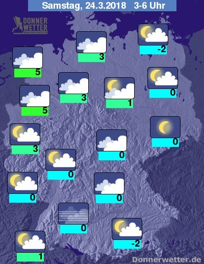 In der folgenden Nacht lockert die Bewölkung besonders im Osten und Süden, später auch im Westen immer weiter auf, zum Teil wird es hierbei auch sternenklar. Meist dicht bewölkt bleibt es hingegen im Norden und Nordwesten der Republik. Es bleibt landesweit trocken bei Tiefstwerten zwischen 5 Grad an der Ems und -2 Grad in Vorpommern.