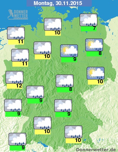Heute ist es am Vormittag in einem breiten Streifen von Niedersachsen, über Sachsen-Anhalt bis nach Brandenburg und Sachsen meist trocken und teils aufgelockert bewölkt, sonst bleiben die Wolken im Land jedoch verbreitet dicht und es fällt immer wieder, zum Teil langanhaltender und auch ergiebiger Regen. Die Höchstwerte liegen bei 7 Grad an der Müritz und um 12 Grad im Rheinland. Der Wind weht oft stürmisch mit teils noch schweren Sturmböen, auf den Bergen und an den Küsten sind orkanartige Böen möglich.