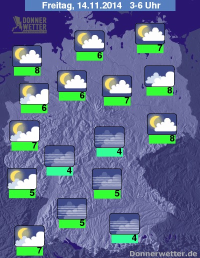 In der Nacht zum Freitag ist es zunächst noch gebietsweise sternenklar, sonst zieht jedoch meist lockere bis aufgelockerte Bewölkung durch, örtlich halten sich auch dichte Wolken. Von der Mitte bis in den Süden des Landes bildet sich stellenweise Nebel oder Hochnebel. Es bleibt überall trocken. Die Temperatur sinkt auf 8 Grad in Berlin und etwa 4 Grad am Alpenrand.
