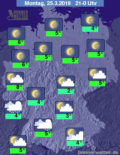 In den Abendstunden zeigt sich der Himmel über weiten Landesteilen zunächst wechselnd oder stark bewölkt und regional muss mit Schauern gerechnet werden. In den höheren Lagen der Mittelgebirge können auch Schneeregen- oder Schneeschauer fallen.