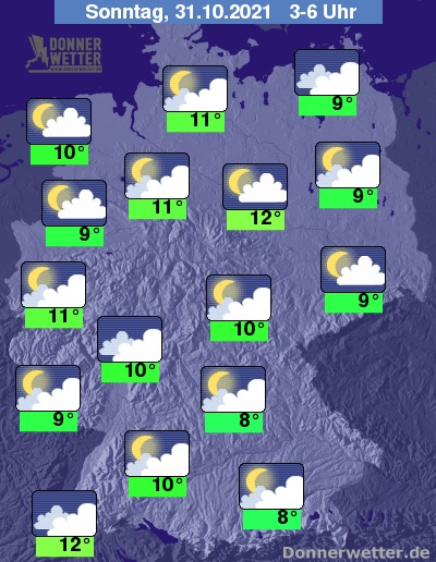 In der folgenden Nacht bleibt der Himmel vielerorts stark bewölkt, hier und da ist es aber auch mal locker bis aufgelockert bewölkt. Anfangs fällt im Westen und Nordwesten noch gebietsweise etwas Regen, ansonsten bleibt es aber trocken. Die Temperatur sinkt auf 12 Grad im Breisgau und bis 8 Grad in Mittelfranken.