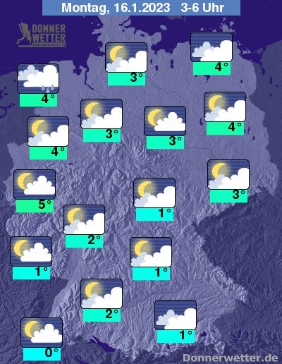 Am Montag ist es im Osten und Südosten noch oft heiter und dabei trocken. Im übrigen Bundesgebiet ist es dagegen überwiegend bedeckt und von Westen her setzt Regen, Schneeregen oder Schneefall ein. Bis zum Abend bleibt es im Nordosten, Osten und Südosten noch weitgehend trocken. Die Temperatur erreicht 2 Grad in Wiesbaden und bis 6 Grad in Dresden. Im Norden weht ein teils stürmischer Wind, an der Nordsee herrscht Sturm.
