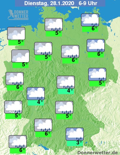 Der Dienstag startet verbreitet mit einer geschlossenen Wolkendecke, dabei muss in weiten Landesteilen mit Regen gerechnet werden. In höheren Lagen können die Niederschläge auch als Schneeregen oder Schnee fallen. Es weht ein meist frischer bis stürmischer Wind, im Süden und auf den Gipfeln der Mittelgebirge sind auch Sturmböen oder orkanartige Böen möglich.
