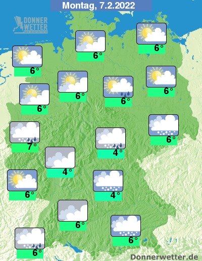 Am Montag ist es vor allem im Norden oft heiter, vor allem im Süden und Osten halten sich jedoch oft auch dichte Wolken, hier bilden sich einzelne Schnee- oder Regenschauer, während es sonst größtenteils trocken bleibt. Die Temperatur steigt auf 4 Grad in Nürnberg und bis 7 Grad in Bonn. Es weht ein oft noch starker bis stürmischer Wind. An der See herrscht häufig auch Sturm.