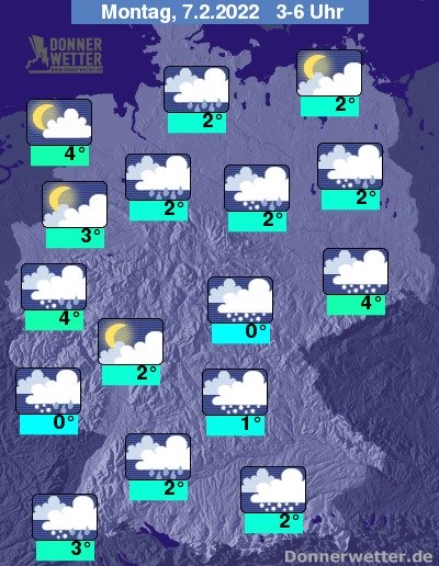 In der folgenden Nacht fällt vor allem über dem Süden und Osten noch teils kräftiger und langanhaltender Regen oder Schnee. Weiter nach Nordwesten hin werden die Regenpausen immer länger, jedoch sind auch in der zweiten Nachthälfte hier einzelne Regen- oder Schneeschauer zu erwarten. Auflockerungen bleiben insgesamt selten. Die Temperatur sinkt auf 4 Grad in Cuxhaven und bis 0 Grad in Jena. Es weht verbreitet starker bis stürmischer Wind, an den Küsten herrscht oft Sturm, an der Nordsee auch schwerer Sturm.