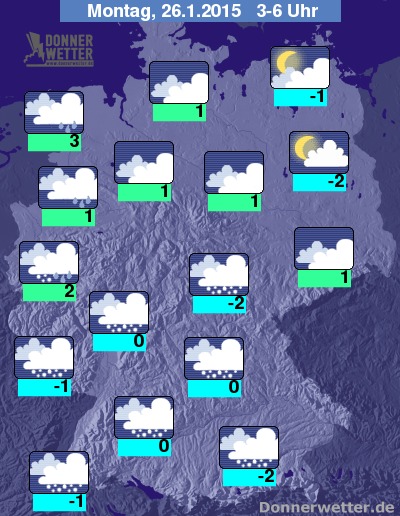In der Nacht zum Montag nehmen auch die Wolkenanteile im Nordosten des Landes zu, oft bleibt es aber noch aufgelockert bewölkt und dazu trocken. In den übrigen Landesteilen fällt aus weitgehend dichten Wolken im Westen und Nordwesten zeitweise Regen oder Schneeregen, in der Südhälfte überwiegend Schnee. Es kann verbreitet gefährlich glatt werden. Die Temperatur sinkt auf 3 Grad in Emden und bis -2 Grad in München.