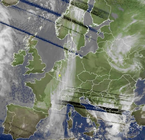 Auf dem Satellitenbild von heute Morgen ist ein äußerst langgestrecktes Wolkenband zu erkennen, welches vom westlichen Mittelmeer, über die Westalpen, Deutschland bis nach Skandinavien reicht. Hierbei handelt es sich um das Frontensystem des Sturmtiefs "Winfried" mit Zentrum über dem Nordatlantik. Entlang des dichten Wolkenbandes fällt verbreitet langanhaltender und zum teil auch ergiebiger Regen.