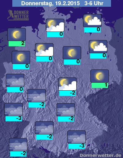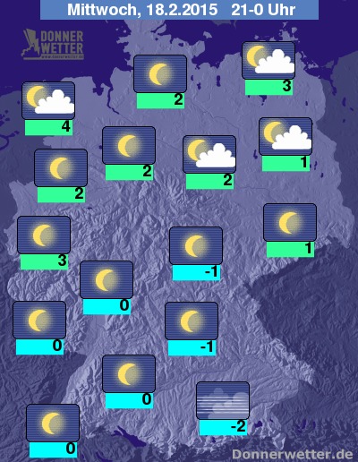 In der Nacht zum Donnerstag ziehen im Norden und Osten gebietsweise einige, teils auch dichte Wolken durch, die jedoch keinen Regen bringen. In den anderen Landesteilen ist es zunächst meist sternenklar, jedoch bildet sich vor allem im Süden und Westen häufig auch Nebel oder Hochnebel, dabei bleibt es trocken. Die Temperatur sinkt auf 2 Grad in Cuxhaven und bis -3 Grad am Pfälzer Wald.