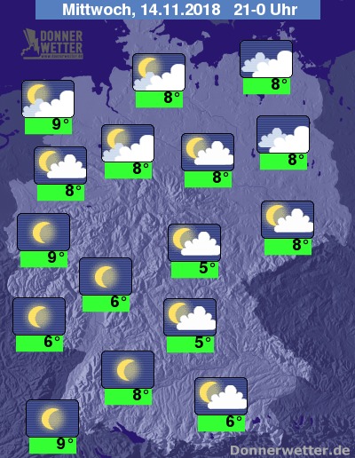 In der zweiten Nachthälfte breiten sich vor allem im Süden wieder Nebelgebiete, sonst zeigt sich der Himmel teils sternenklar, teils bewölkt.
