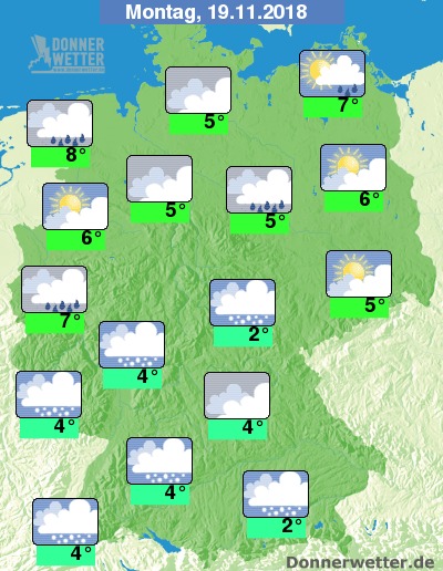Zum Start in die neue Woche dminieren wieder meist dichte Wolken das Wettergeschehen, dabei kann es bevorzugt über der Nordhälfte des Landes auch hier und da auflockern. Im Süden bleiben Auflockerungen hingegen selten, hier fällt zudem gebietsweise Schnee. Im Norden und Westen sind nur seltene Regenschauer möglich. Die Temperatur erreicht 2 bis 8 Grad.