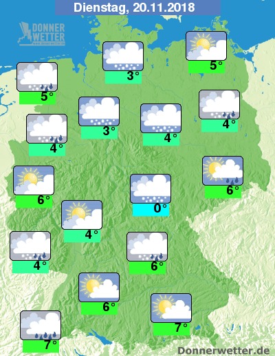 Am Dienstag ist es im Süden oft heiter bis sonnig, lediglich am Schwarzwald können dichtere Wolken etwa Regen bringen. Weiter nach Norden hin ist es hingegen meist dicht bewölkt und es fällt gebietsweise auch Schnee oder Schneeregen. Die Temperatur steigt auf 0 bis 7 Grad.