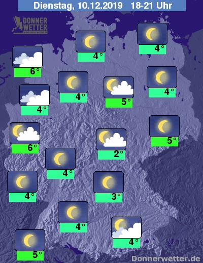 Heute Abend verdichten sich die Wolken westlich von Ems und Niederrhein, es bleibt aber noch weitgehend trocken. Im übrigen Land ist es mehrheitlich sternenklar oder gering bewölkt, dazu bleibt es trocken. Die Temperatur liegt bei 2 Grad im Vogtland und etwa 6 Grad an der Nordsee.