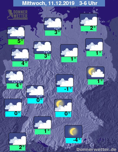 In der Nacht zum Mittwoch ziehen von Nordwesten her kompakte Wolken und Regen bis etwa über die Nordwesthälfte Deutschlands. Dagegen bleibt es über der Südosthälfte des Landes bis zum Morgen noch trocken, jedoch nimmt auch hier die Bewölkung Stück für Stück zu. Die Temperatur sinkt auf 5 Grad im Emsland und bis -4 Grad in Rosenheim.
