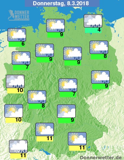 Zunächst wechseln sich Sonne und Wolken miteinander ab. Gebietsweise scheint die Sonne auch für längere Zeit. Im Nordosten fällt anfangs noch etwas Regen oder Schnee. Etwa ab Mittag setzt im Westen und Nordwesten teils schauerartiger Regen ein. Dieser Regen zieht bis zum Abend über den Norden und die Mitte des Landes hinweg. Im Süden bleibt es mit Ausnahme einzelner weniger Schauer niederschlagsfrei. Die Tageshöchsttemperaturen erreichen 3 bis 12 Grad, wobei die niedrigsten Werte ganz im Nordosten und die höchsten Werte am Oberrhein vorzufinden sind. Der Wind frischt vor allem im Nordwesten unangenehm böig auf.