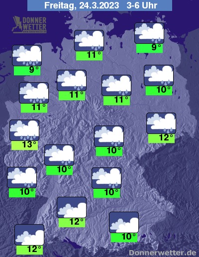 In der Nacht auf Freitag zeigt sich der Himmel meist bedeckt oder es ist stark bewölkt. Von Westen her breiten sich teils schauerartige Regenfälle aus, die im weiteren Verlauf auch die Mitte und den Osten Deutschlands erreichen.
