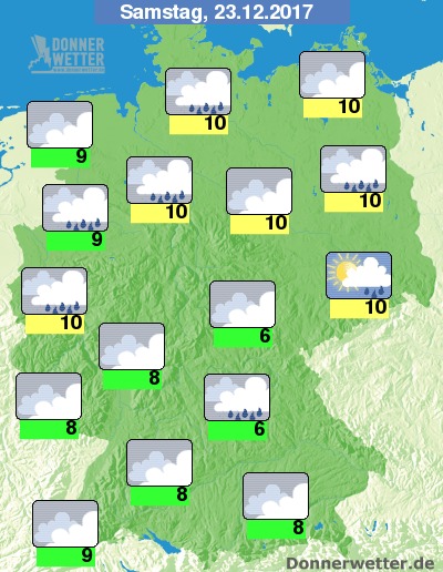 Am Samstag ziehen dichte Wolken und Regen über die Nordhälfte Deutschlands. Im Süden ist es ebenfalls meist dicht bewölkt, dazu fällt hier aber nur selten Regen. Die Temperatur erreicht 6 bis 10 Grad.