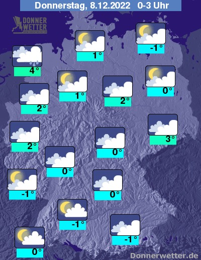 Die Temperaturen gehen in der Nacht auf Werte um 4 Grad an der Nordseeküste und -1 Grad am Oberrhein zurück.