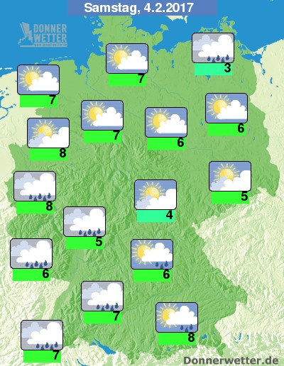 Am Samstag zieht im Südwesten aus Südwesten dichte Bewölkung und Regen auf, der sich bis zum Abend auch bis nach Bayern, Hessen und über NRW ausbreitet. Gebietsweise Regen fällt bei meist dichten Wolken auch in Vorpommern. Im übrigen Land ist es teils stärker, teils aber auch locker bis aufgelockert bewölkt und dazu trocken. Die Temperatur steigt auf 3 Grad auf Rügen und bis 8 Grad im Rheinland.